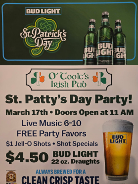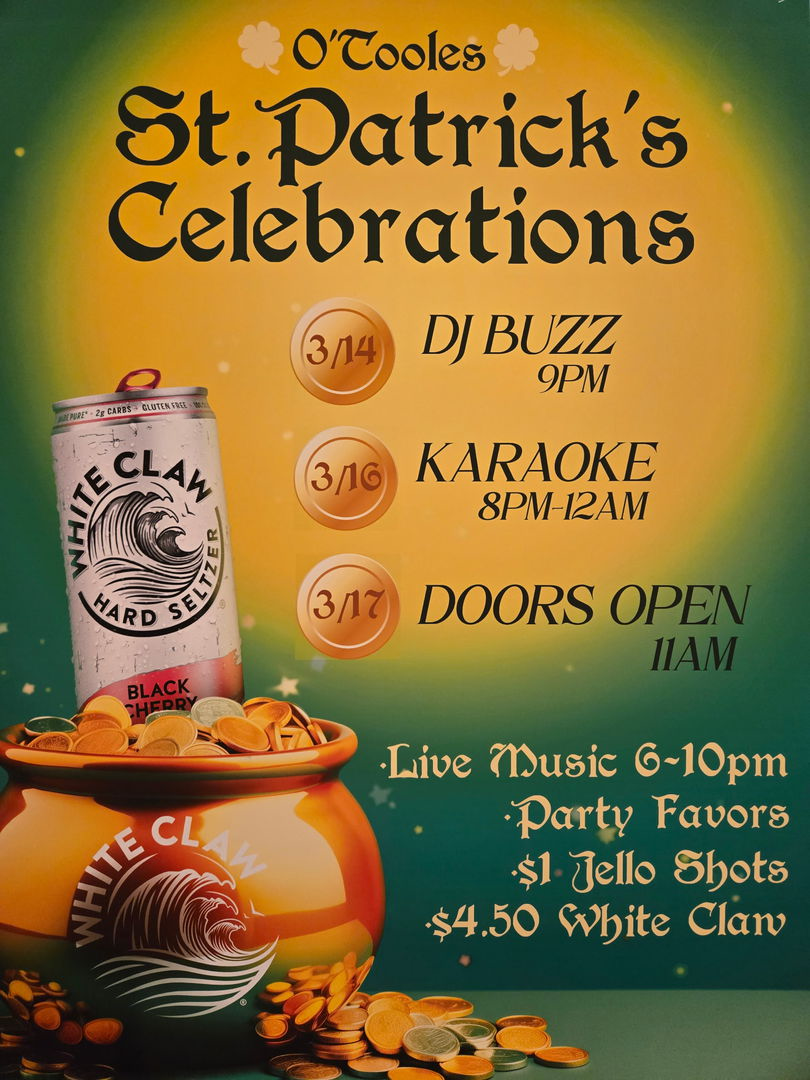 O'Toole's Irish Pub, nestled in the heart of Reynoldsburg, has been a beloved gathering spot for 30 years. It boasts a vibrant party atmosphere with daily specials and entertainment on weekends. The pub's familiar neighborhood setting attracts many regulars for happy hour, where they're often found perched on their bar stools, chatting with friends like family and sharing laughs with their favorite bartenders. Drop by O'Toole's to discover all it has to offer; you might just find your second home.